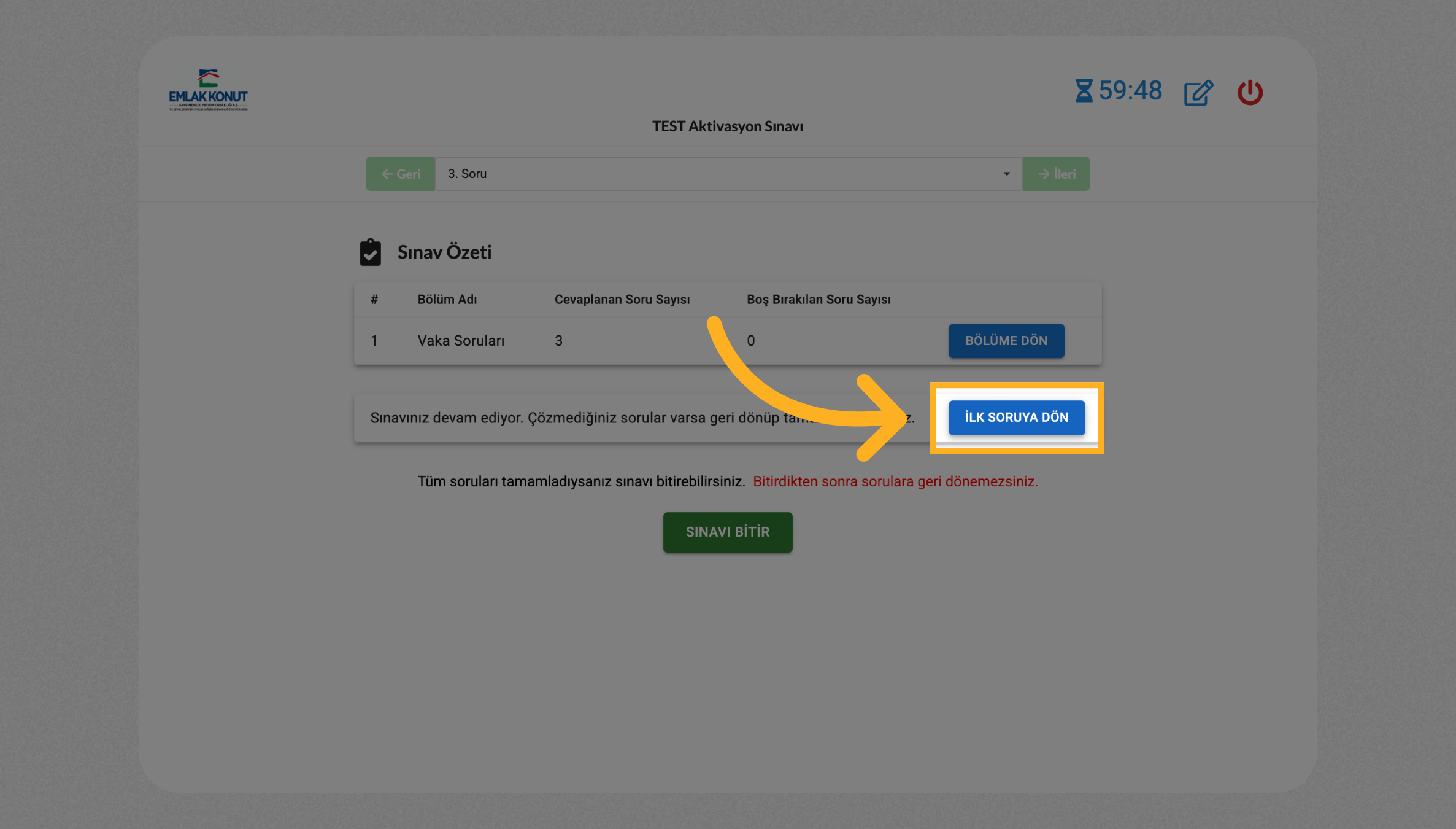 "İlk Soruya Dön" butonuna tıklayarak soruları gözden geçirin.