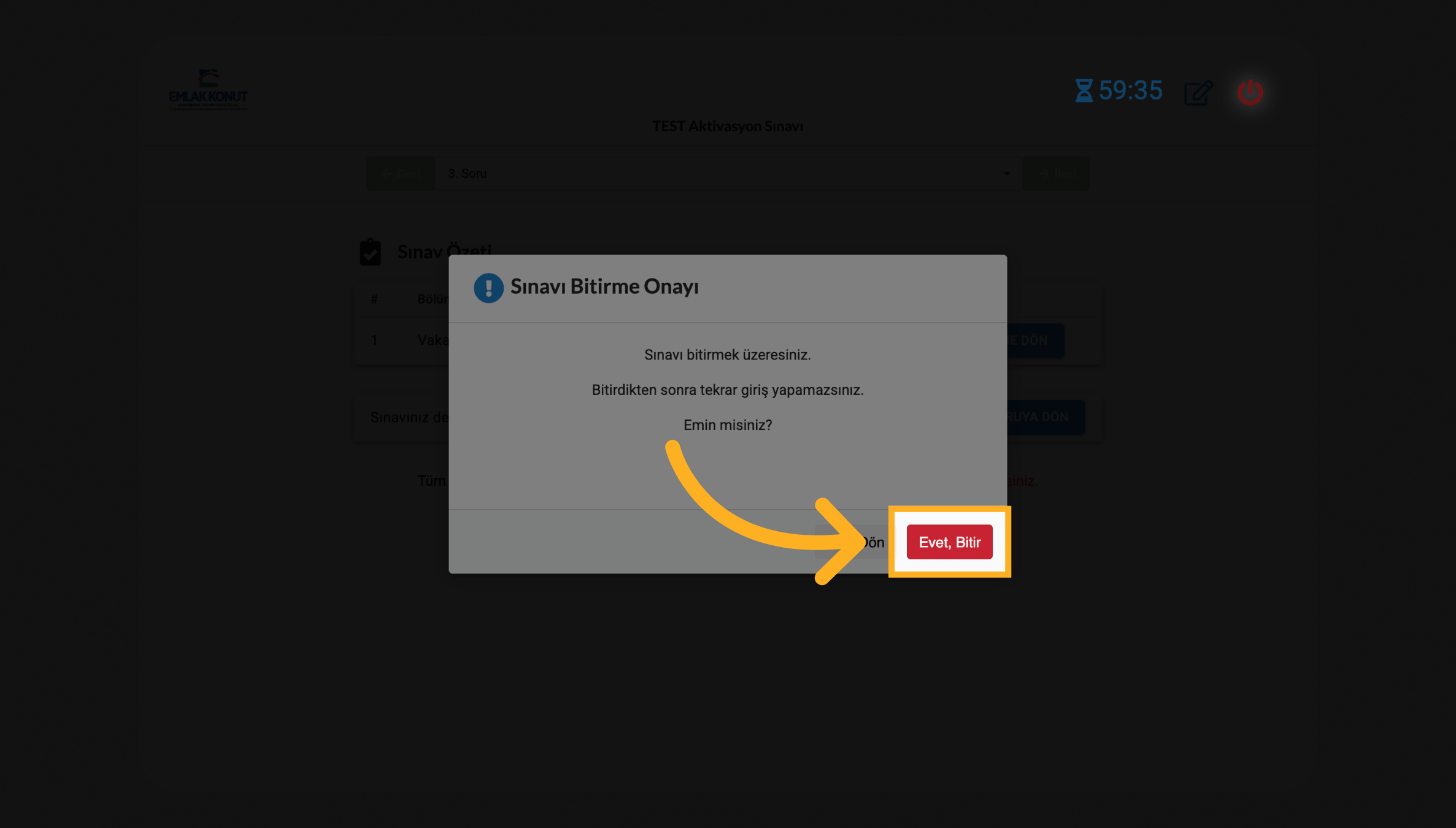 "Sınavı Bitir" butonuna tıklayın.