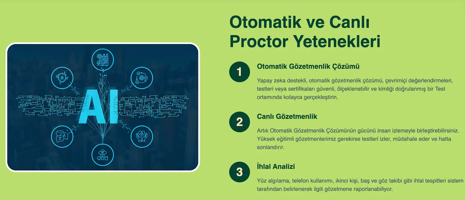 Yapay zeka destekli gözetmenlik teknolojisi; sınav veya mülakat esnasında katılımcıların davranışlarını izleyerek olası kopya veya ihlal girişimlerini tespit eder ve sınav sürecinin adil bir şekilde yürütülmesini sağlar.